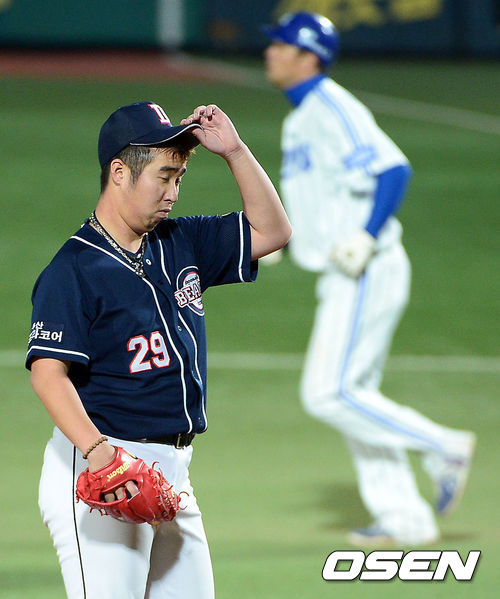1일 오후 대구구장에서 열리는 '2013 한국야쿠르트 세븐 프로야구' 한국시리즈 7차전 삼성 라이온즈와 두산 베어스의 경기, 3회말 1사 1루 두산 유희관이 최형우에게 볼넷을 허용하고 있다.