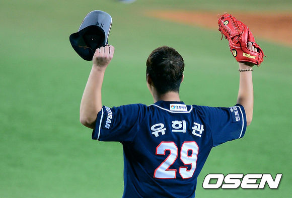 1일 오후 대구구장에서 열린 '2013 한국야쿠르트 세븐 프로야구' 한국시리즈 7차전 삼성 라이온즈와 두산 베어스의 경기, 3회말 2사 만루에서 두산 유희관이 삼성 김태완을 좌익수플라이로 처리하고 기뻐하고 있다.