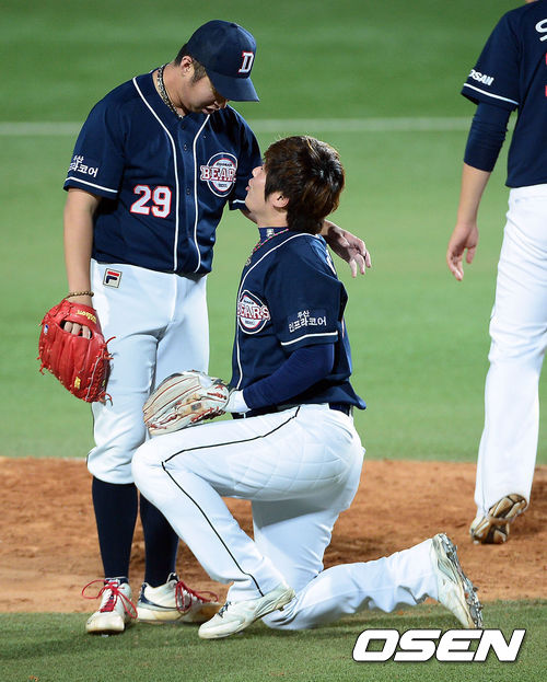 1일 오후 대구구장에서 열리는 '2013 한국야쿠르트 세븐 프로야구' 한국시리즈 7차전 삼성 라이온즈와 두산 베어스의 경기, 4회말 무사 두산 이원석과 유희관이 삼성 진갑용의 뜬공을 잡으려다 충돌한 뒤 이야기를 나누고 있다.