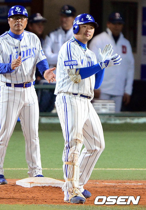 1일 오후 대구구장에서 열린 '2013 한국야쿠르트 세븐 프로야구' 한국시리즈 7차전 삼성 라이온즈와 두산 베어스의 경기 5회말 선두타자 박한이가 좌전안타를 치고 박수를 치고 있다.
