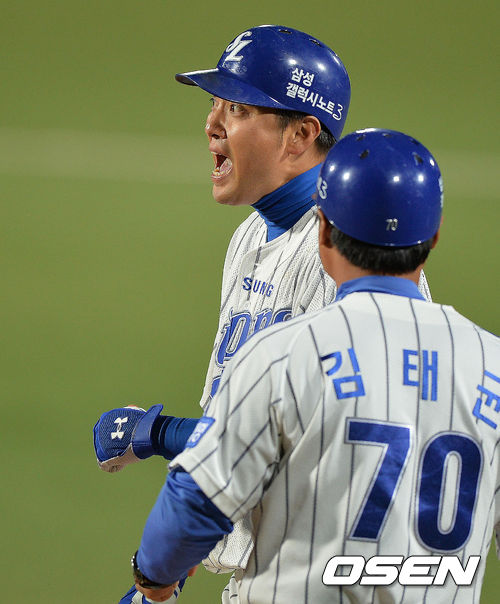1일 오후 대구구장에서 열리는 '2013 한국야쿠르트 세븐 프로야구' 한국시리즈 7차전 삼성 라이온즈와 두산 베어스의 경기, 5회말 무사 1루 채태인 1루 강습 안타를 치고 1루에서 환호하고 있다.