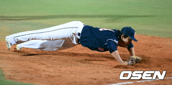 1일 오후 대구구장에서 열린 '2013 한국야쿠르트 세븐 프로야구' 한국시리즈 7차전 삼성 라이온즈와 두산 베어스의 경기, 5회말 무사 1루에서 두산 오재일이 삼성 채태인의 1루 땅볼 타구에 몸을 날렸지만 놓치고 있다.