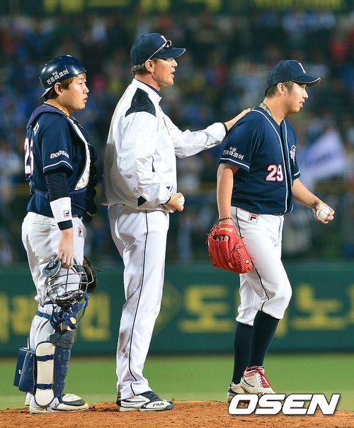 1일 오후 대구구장에서 열린 '2013 한국야쿠르트 세븐 프로야구' 한국시리즈 7차전 삼성 라이온즈와 두산 베어스의 경기, 5회말 삼성 공격 1사 만루 상황 두산 선발 유희관이 마운드를 내려가고 있다.