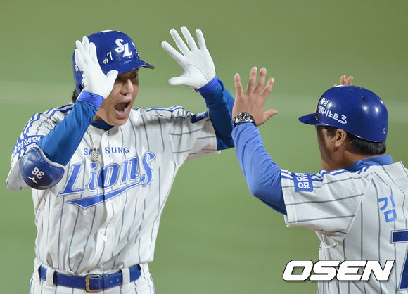 1일 오후 대구구장에서 열리는 '2013 한국야쿠르트 세븐 프로야구' 한국시리즈 7차전 삼성 라이온즈와 두산 베어스의 경기, 5회말 1사 만루 이승엽 동점 적시타를 날리고 1루에서 환호하고 있다.