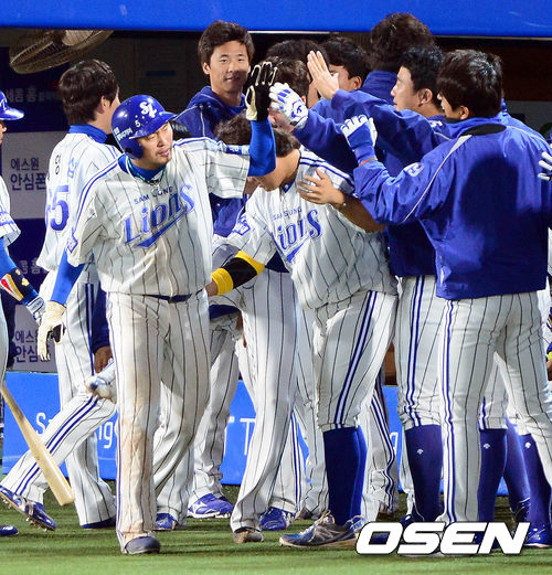 1일 오후 대구구장에서 열린 '2013 한국야쿠르트 세븐 프로야구' 한국시리즈 7차전 삼성 라이온즈와 두산 베어스의 경기 5회말 1사 만루 이승엽의 1타점 적시타에 홈을 밟은 박한이가 덕아웃에서 동료들과 하이파이브를 하고 있다.