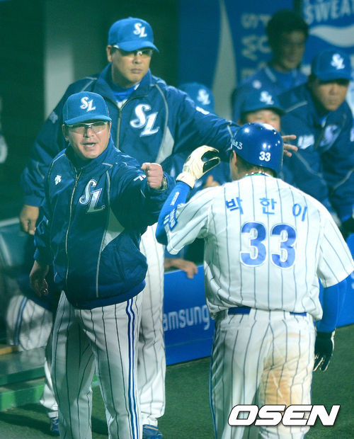 1일 오후 대구구장에서 열린 '2013 한국야쿠르트 세븐 프로야구' 한국시리즈 7차전 삼성 라이온즈와 두산 베어스의 경기, 5회말 1사 만루에서 삼성 박한이가 이승엽의 동점 적시타에 홈을 밟고 더그아웃에서 류중일 감독과 주먹을 맞대고 있다.