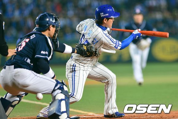 1일 오후 대구구장에서 열린 '2013 한국야쿠르트 세븐 프로야구' 한국시리즈 7차전 삼성 라이온즈와 두산 베어스의 경기, 6회말 삼성 공격 무사 1루 상황 배영섭이 스리번트를 시도했지만 파울이 되며 아웃되고 있다.