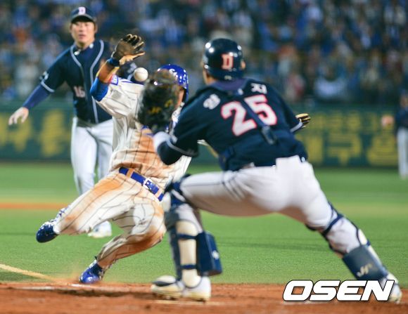 1일 오후 대구구장에서 열린 '2013 한국야쿠르트 세븐 프로야구' 한국시리즈 7차전 삼성 라이온즈와 두산 베어스의 경기, 6회말 삼성 공격 1사 만루 상황 최형우의 3루수 땅볼 때 두산 3루수 이원석의 송구가 홈으로 쇄도하는 3루 주자 정병곤 쪽으로 향하고 있다. 송구가 뒤로 빠지며 정병곤이 홈에서 세이프 되며 삼성 역전.