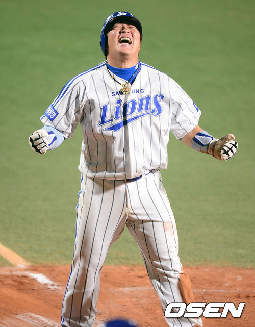 1일 오후 대구구장에서 열린 '2013 한국야쿠르트 세븐 프로야구' 한국시리즈 7차전 삼성 라이온즈와 두산 베어스의 경기, 6회말 1사 2,3루 삼성 박석민의 2타점 적시타때 2루 주자 최형우가 홈 세이프 후 환호하고 있다.