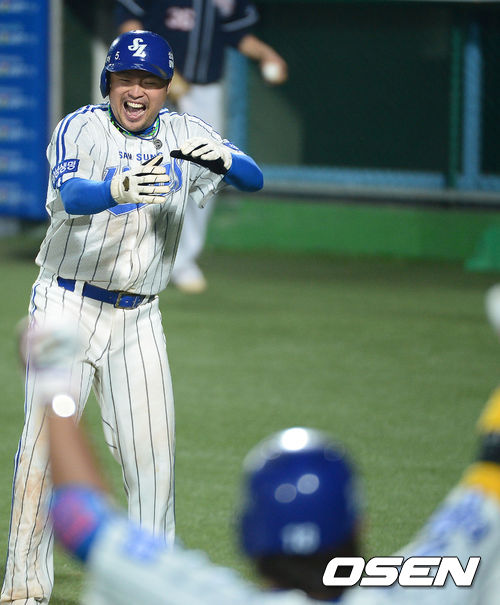 1일 오후 대구구장에서 열리는 '2013 한국야쿠르트 세븐 프로야구' 한국시리즈 7차전 삼성 라이온즈와 두산 베어스의 경기, 6회말 1사 만루 삼성 2루 주자 박한이가 최형우의 3루수 앞 땅볼 타구때 두산 이원석의 송구실책으로 득점을 올리고 있다.