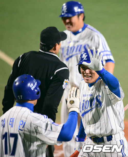 1일 오후 대구구장에서 열린 '2013 한국야쿠르트 세븐 프로야구' 한국시리즈 7차전 삼성 라이온즈와 두산 베어스의 경기, 6회말 1사 2,3루 삼성 박석민의 2타점 적시타때 이승엽이 득점을 올린 채태인, 최형우와 하이파이브를 하고 있다