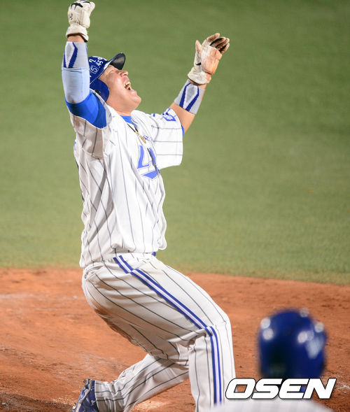 1일 오후 대구구장에서 열린 '2013 한국야쿠르트 세븐 프로야구' 한국시리즈 7차전 삼성 라이온즈와 두산 베어스의 경기, 6회말 1사 2,3루 삼성 박석민의 2타점 적시타때 2루 주자 최형우가 홈 세이프 후 환호하고 있다.
