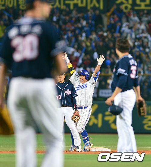 1일 오후 대구구장에서 열린 '2013 한국야쿠르트 세븐 프로야구' 한국시리즈 7차전 삼성 라이온즈와 두산 베어스의 경기, 6회말 삼성 공격 1사 2, 3루 상황 박석민이 싹쓸이 2타점 안타를 날리고 2루에 세이프된 뒤 환호하고 있다.