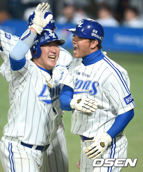 1일 오후 대구구장에서 열리는 '2013 한국야쿠르트 세븐 프로야구' 한국시리즈 7차전 삼성 라이온즈와 두산 베어스의 경기, 6회말 1사 2,3루 삼성 박석민이 적시타때 득점을 올린 최형우와 채태인이 기뻐하고 있다.