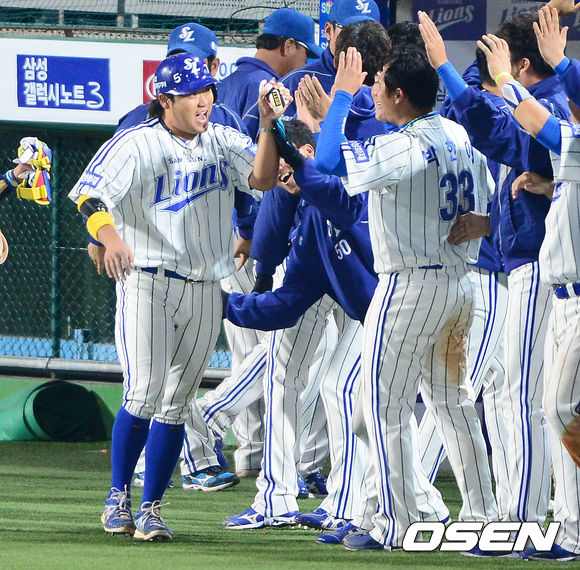 1일 오후 대구구장에서 열린 '2013 한국야쿠르트 세븐 프로야구' 한국시리즈 7차전 삼성 라이온즈와 두산 베어스의 경기 6회말 2사 2루 김태완의 1타점 2루타에 홈을 밟은 박석민이 덕아웃에서 동료들과 하이파이브를 하고 있다.
