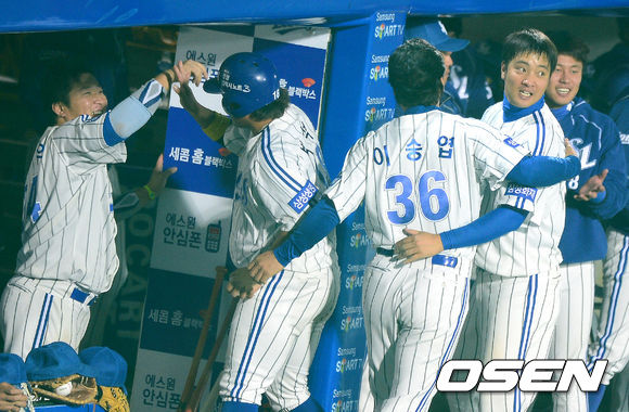 1일 오후 대구구장에서 열린 '2013 한국야쿠르트 세븐 프로야구' 한국시리즈 7차전 삼성 라이온즈와 두산 베어스의 경기, 6회말 2사 3루에서 삼성 김태완의 1타점 적시 2루타에 박석민이 홈을 밟고 더그아웃에서 동료선수들과 기뻐하고 있다.