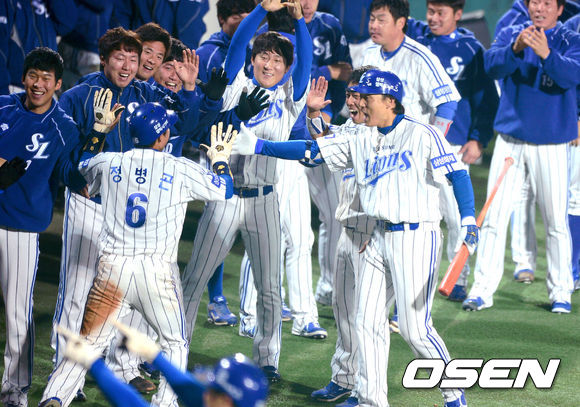 1일 오후 대구구장에서 열린 '2013 한국야쿠르트 세븐 프로야구' 한국시리즈 7차전 삼성 라이온즈와 두산 베어스의 경기, 6회말 1사 만루 최형우의 내야땅볼때 3루 주자 정병곤이 두산 이원석 3루수의 송구실책을 틈타 홈세이프됐다. 정병곤이 동료들의 축하를 받고 있다.