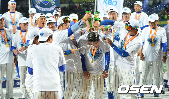 경기종료 후 MVP로 선정된 삼성 박한이가 삼페인 세례를 받고 있다./ dreamer@osen.co.kr