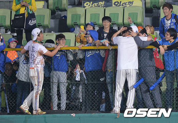 안지만과 신용운이 외야펜스에서 팬들과 함께 승리의 기쁨을 나누고 있다./ ajyoung@osen.co.kr