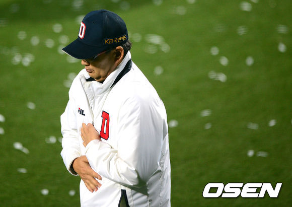 두산 김진욱 감독이 인터뷰를 위해 그라운드에 들어서며 아쉬운 표정을 짓고 있다./jpnews@osen.co.kr