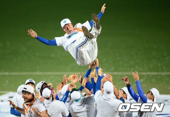 삼성 김태한 코치가 헹가래를 받으며 우승을 기뻐하고 있다./jpnews@osen.co.kr