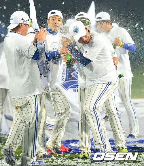 경기종료 후 삼성 이승엽이 후배들에게 샴페인 세례를 받고 있다./ dreamer@osen.co.kr