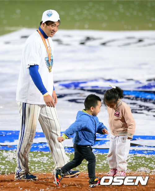 삼성 채태인이 아들 딸과 함께 그라운드에서 우승을 기뻐하고 있다./jpnews@osen.co.kr