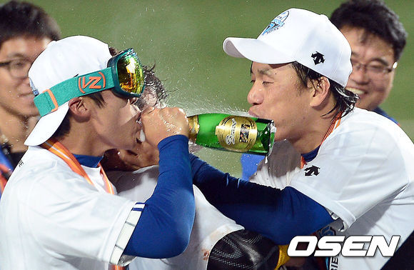 박석민 얼굴에 삼페인 뿌리는 이승엽
