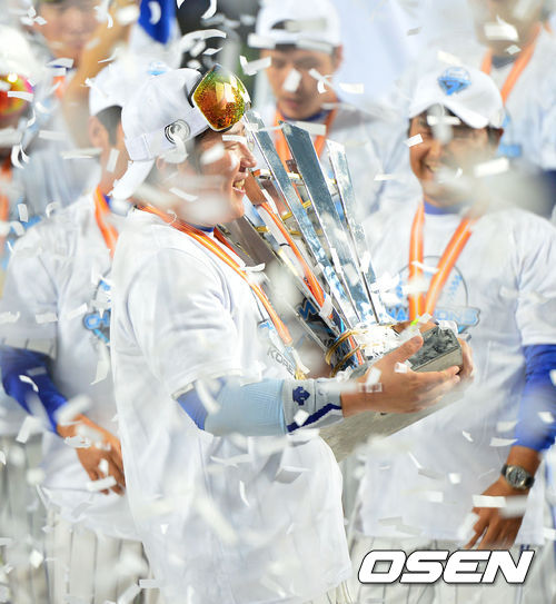 경기종료 후 삼성 주장 최형우가 우승 트로피를 들고 환호하고 있다./ dreamer@osen.co.kr