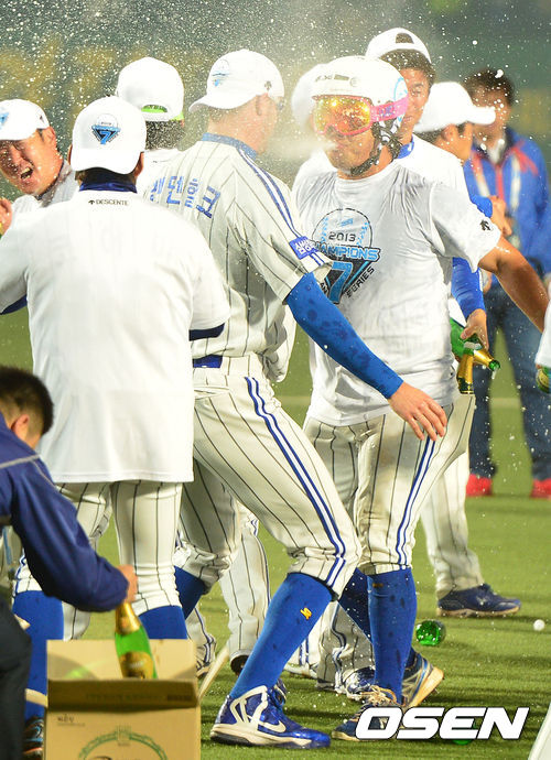 경기종료 후 삼성 박석민이 샴페인을 뿌리고 있다./ dreamer@osen.co.kr