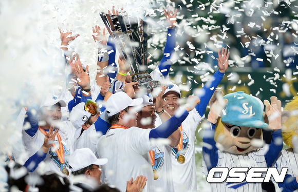 우승을 거둔 삼성 선수들이 우승 트로피를 들어올리고 있다./spjj@osen.co.kr