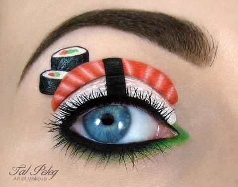최근 온라인 커뮤니티를 중심으로 '생선초밥 눈 화장'이라는 제목의 사진 한 장이 올라왔다. 메이크업 아티스트인 탈 펠레그가 눈꺼풀에 정교한 그림을 그리는 방식으로 선보인 작품 중 하나로, 익숙한 연어초밥 모양으로 눈화장을 한 것.
