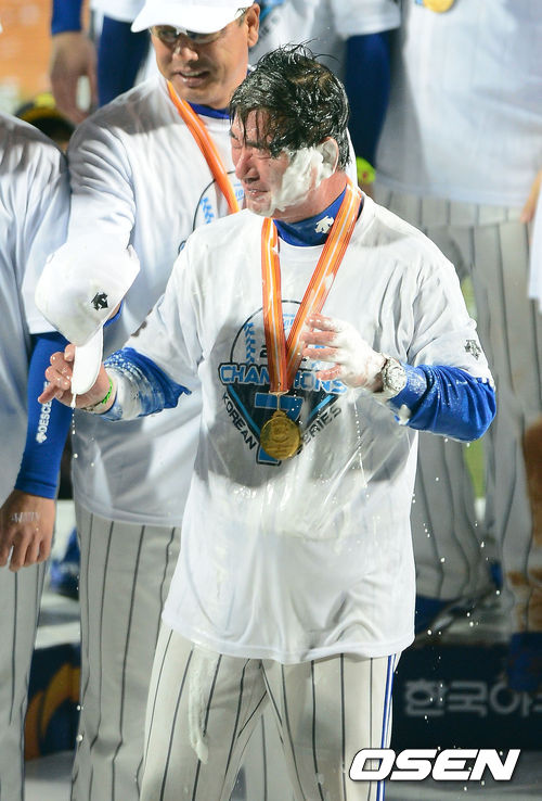경기종료후 삼성 류중일 감독이 샴페인 세례를 받고 있다. / jpnews@osen.co.kr