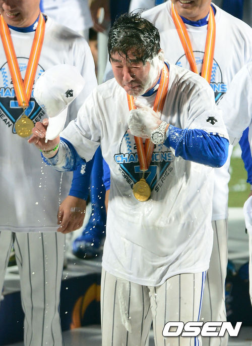 경기종료후 삼성 류중일 감독이 샴페인 세례를 받고 있다. / jpnews@osen.co.kr