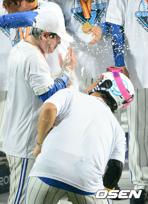 경기종료후 삼성 류중일 감독이 샴페인 세례를 받고 있다. / jpnews@osen.co.kr