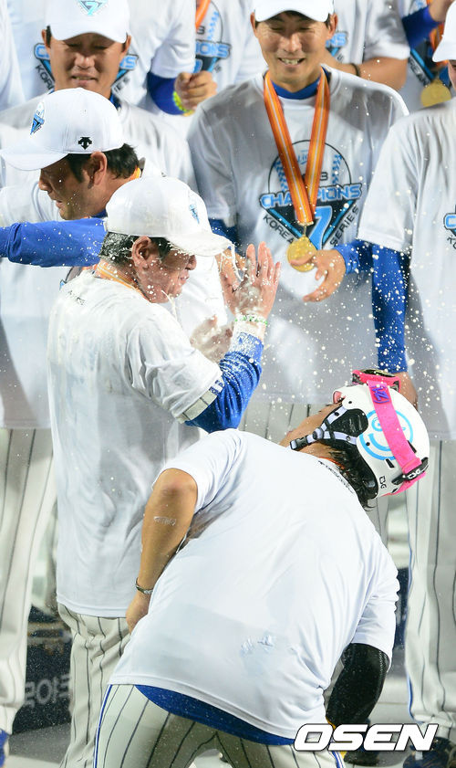 경기종료후 삼성 류중일 감독이 샴페인 세례를 받고 있다. / jpnews@osen.co.kr