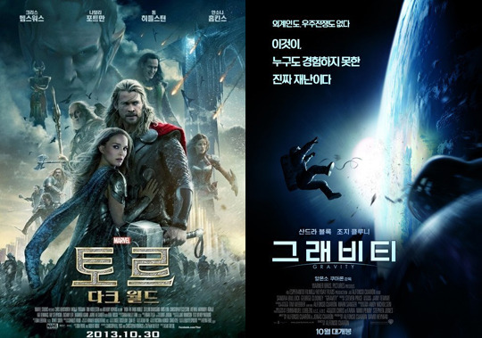 한 마디로, CGV에 '토르' 없고 롯데 시네마에 '그래비티' 안 보인다. 체면치레로 한 두 관에 겨우 걸어놓은 지점도 보이지만 그나마 사이드관에 퐁당퐁당 상영이기 일쑤다. 그러니 영화팬들은 여기서 강요 아닌 강요를 받게된다. '토르'를 보려면 롯데 시네마를 가든지 아니면 CGV 가서 '그래비티' 관람하라는 식이다.