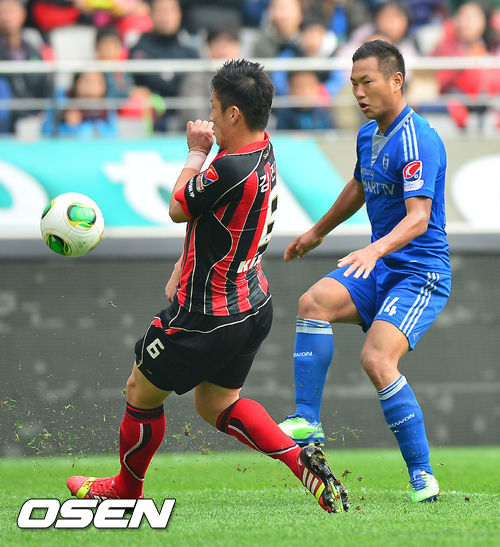 2일 오후 서울월드컵경기장에서 현대오일뱅크 K리그 클래식 2013 35라운드 FC서울과 수원 삼성 경기, 전반 수원 정대세가 서울 김진규의 수비를 피하며 슛을 날리고 있다.