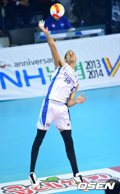 2세트 삼성화재 레오가 서브를 하고 있다.