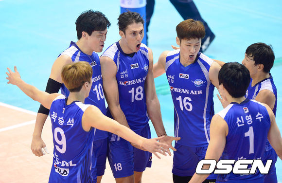 2세트 대한항공 선수들이 득점에 환호하고 있다.
