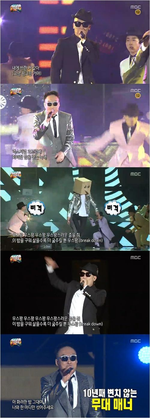이들은 거머리라는 이름으로 흥겨운 무대를 만들었다. 특히 박명수가 짜증 섞인 목소리로 ‘아가씨’, ‘싫음 말어’를 외치는 모습은 재미를 선사했다. 중독성 넘치는 음악과 세 사람의 뛰어난 조합, 여기에 박명수의 생활 밀착형 랩은 친근한 즐거움을 선사했다.