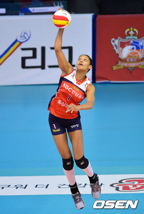 2세트 인삼공사 조이스가 서브를 하고 있다.