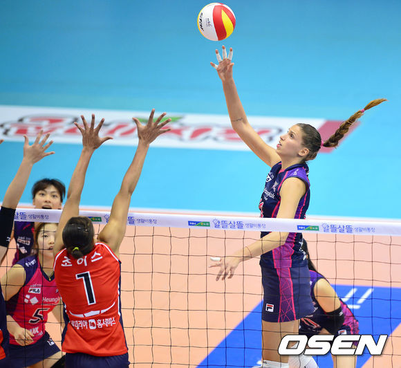 1세트 흥국생명 바실레바가 인삼공사의 블로킹을 피해 공격을 시도하고 있다.