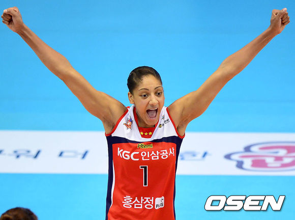 2세트 인삼공사 조이스가 득점 후 환호하고 있다.
