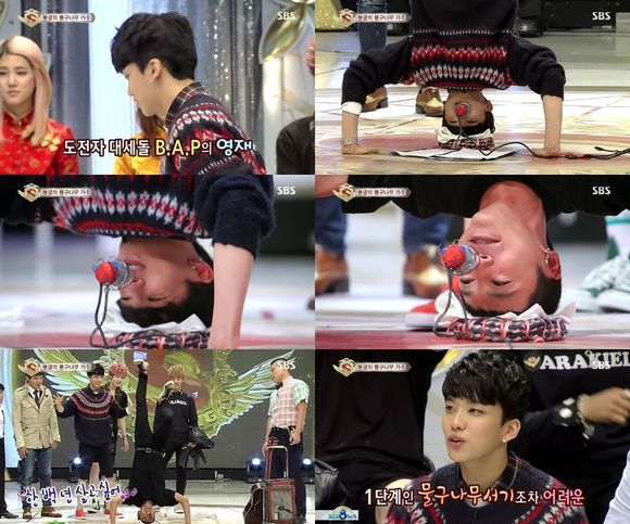 아이돌그룹 B.A.P가 물구나무 서서 노래하기 실패하며 물구나무 서서 노래하는 출연자의 모습을 보고 감탄했다.