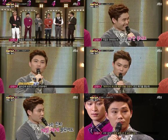 그리고 예상대로 김범수는 3번방에서 나왔고, 이후 "정말 소리를 키운 건가 아니면 마이크를 가까이 댄 것인가"라는 질문을 받고는 "얼마전에 류현진 선수가 인터뷰에서 '태어나서 최고로 세게 공을 던졌다'라고 이야기를 했는데 진짜 제일 세게 불렀다"고 답해 현장을 웃음바다로 만들었다.