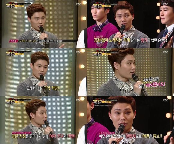 김범수는 2일 오후 방송된 JTBC '히든싱어2'에서 "노래에 슬픈 감정을 집어넣기 위해 여자친구와 헤어진 적 있다"고 밝혔다.