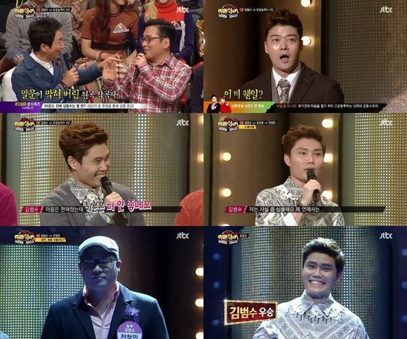 김범수는 2일 오후 방송된 '히든싱어2'에서 쟁쟁한 모창 능력자들을 제치고 최종 우승을 차지하는 기쁨을 맛봤다.
