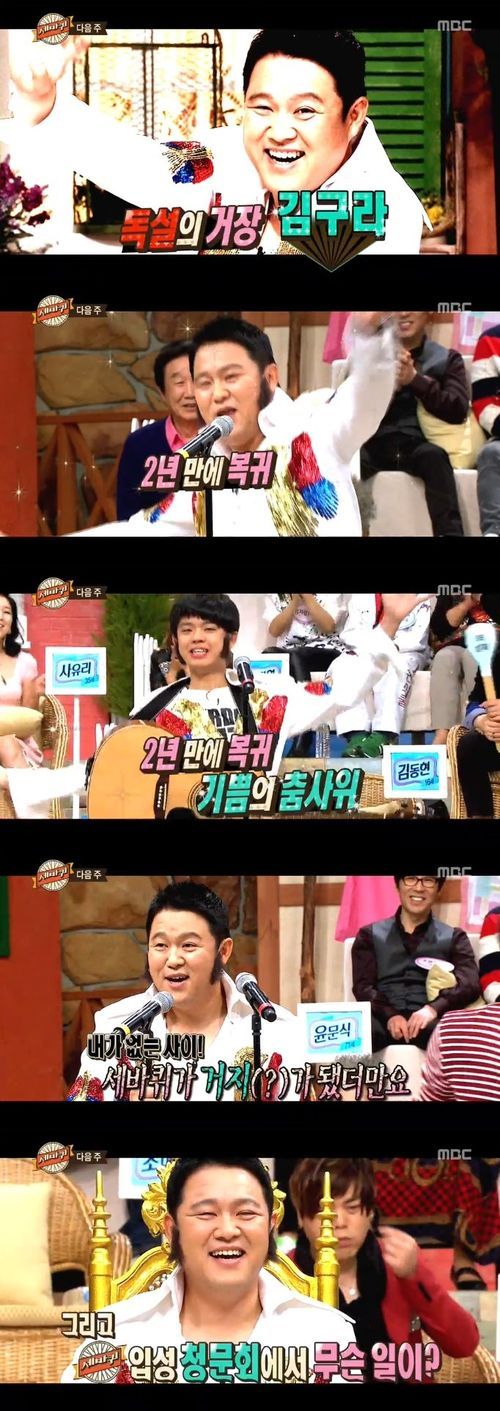 지난 2일 ‘세바퀴’ 방송 말미 예고편에서는 MC로 컴백하는 김구라의 모습이 전파를 탔다. 김구라는 아들 동현과 특별 공연을 하는가 하면, “내가 없는 사이 ‘세바퀴’가 거지가 됐다. 반토막이 났다”며 거침없는 독설을 날려 다른 출연진을 당황하게 했다.