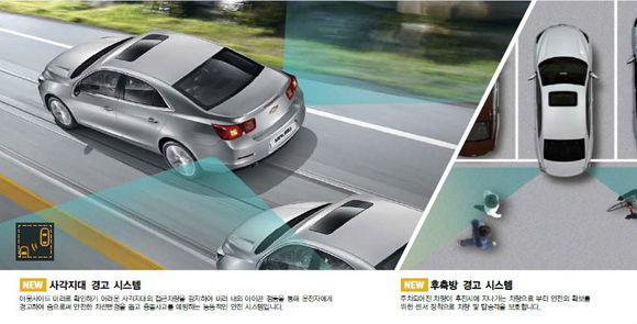 2014년형 '말리부'는 주행 사각지대 범위 내 차량을 감지해 운전자에게 시각적 경고 메시지를 전달하는 사각지대 경고 시스템(SBZA: Side Blind Zone Alert)을 적용해 차선 변경 시 발생할 수 있는 사고를 사전에 예방한다.